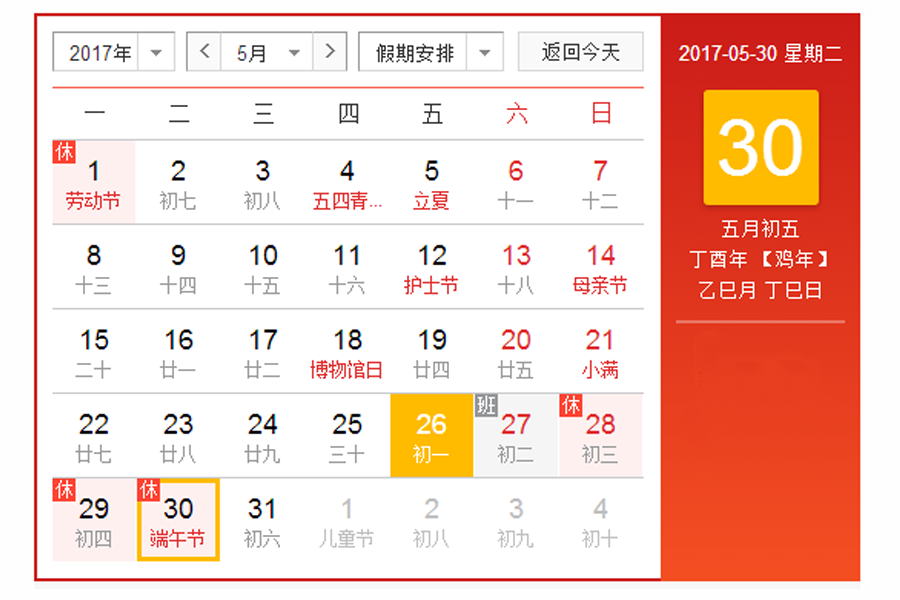 2017年5月28日(周日)至5月30日(周二)放假共3天。