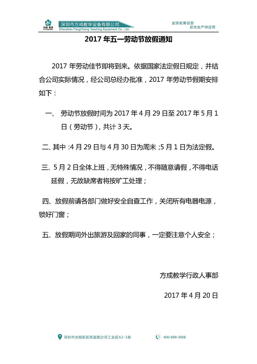2017年勞動(dòng)佳節(jié)即將到來。依據(jù)國家法定假日規(guī)定,并結(jié)合公司實(shí)際情況,經(jīng)公司總經(jīng)辦批準(zhǔn),2017年勞動(dòng)節(jié)