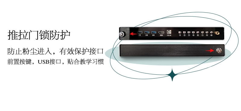 機(jī)身保護(hù)——獨特的推拉門鎖設(shè)計,保護(hù)前置按鍵及接口,還能收納白板筆和教鞭;