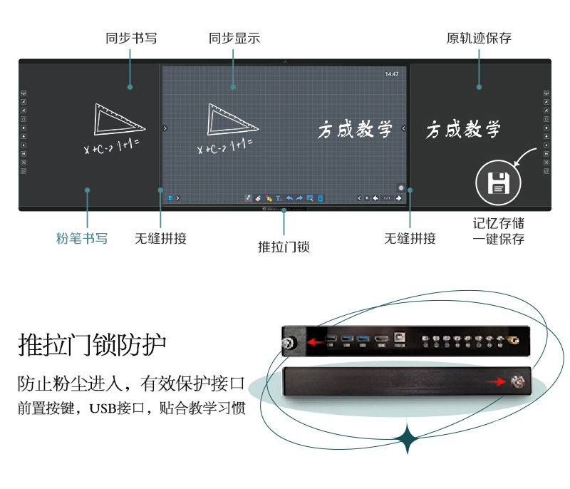 機(jī)身保護(hù)——獨(dú)特的推拉門鎖設(shè)計(jì),保護(hù)前置按鍵及接口,還能收納白板筆和教鞭;